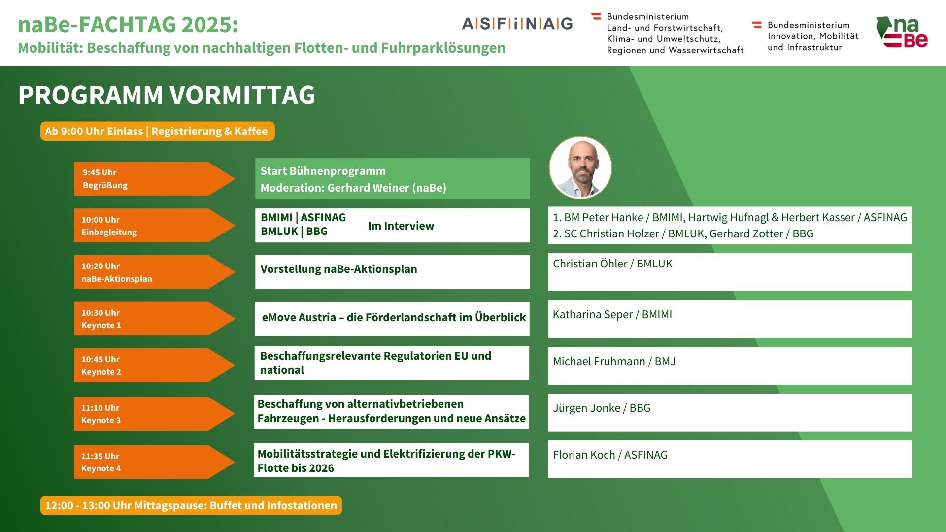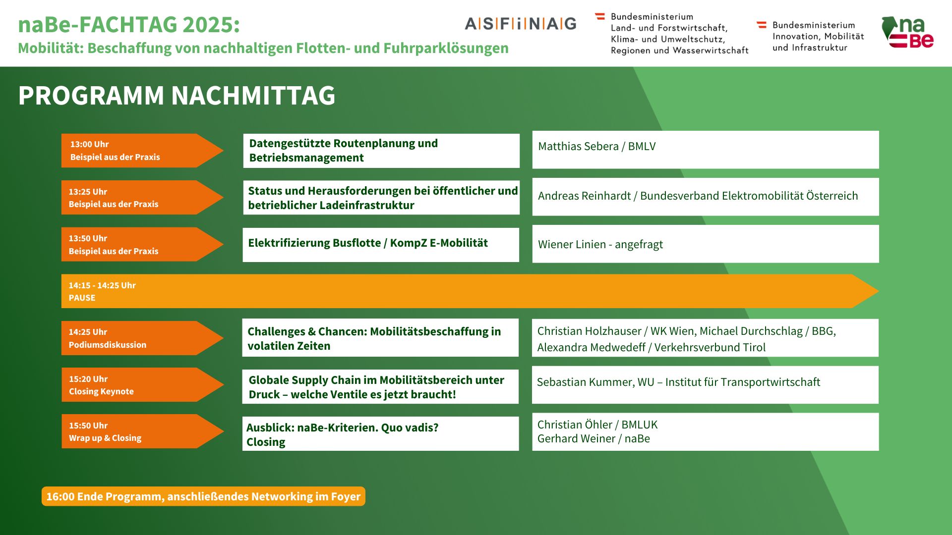 Dieses Jahr wurde für den naBe-Fachtag als Überthema Mobilität gewählt – damit dreht sich alles rund um nachhaltige Flotten- und Fuhrparklösungen, E-Mobilitätsstrategien, erneuerbare Kraftstoffe, alternative Antriebsarten, Lebenszyklen & Ladeinfrastrukturen sowie innovative Finanzierungsmodelle & Förderungen – und alle damit verbundenen beschaffungsrelevanten Aspekte. Der Fachtag 2025 findet in Kooperation mit der ASFINAG, dem Bundesministerium für Land- und Forstwirtschaft, Umwelt, Klima, Regionen und Wasserwirtschaft (BMLUK) sowie dem Bundesministerium für Innovation, Mobilität und Infrastruktur (BMIMI) statt.